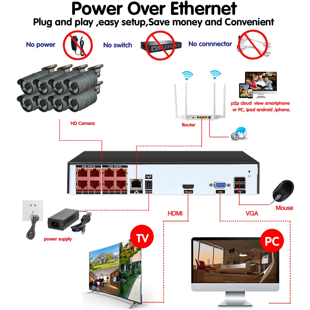 NINIVISION 8CH 1080P POE NVR CCTV System Kit with 8PCS 1080P 2MP IR 35M Bullet POE IP Camera Outdoo