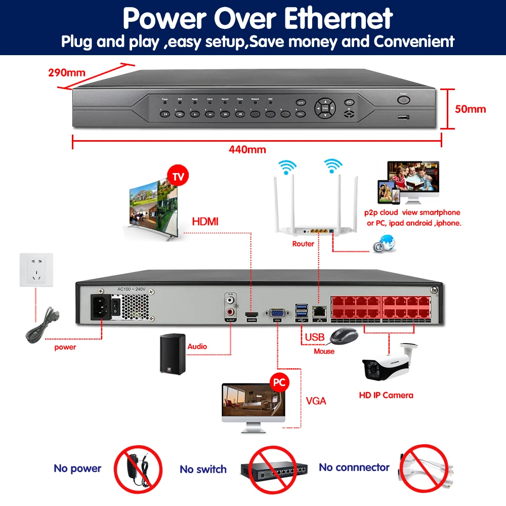 4K 16CH NVR HDMI POE NVR Kit CCTV Security System Audio Record NVR 16pcs POE IP Camera P2P Video Se